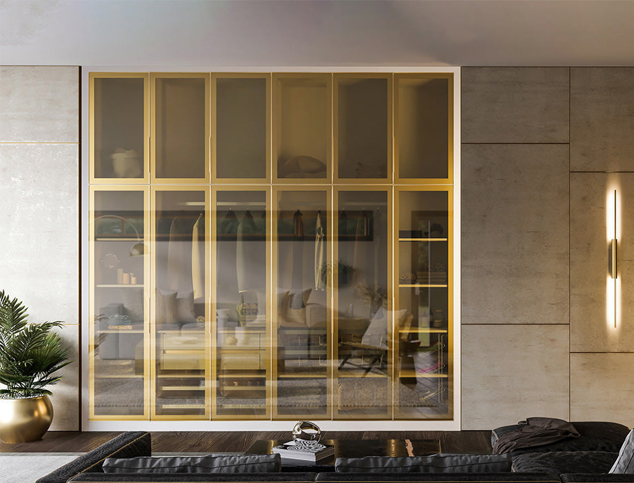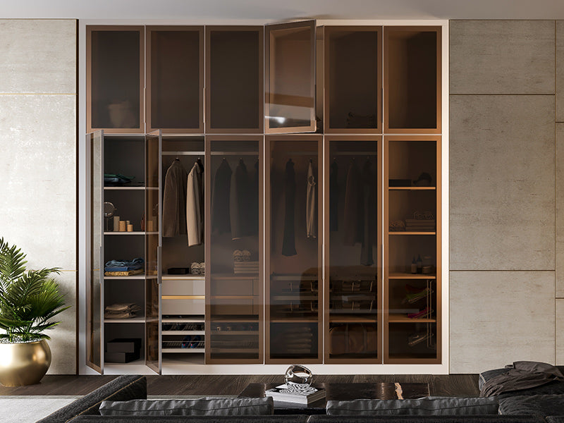A fully customizable built-in wardrobe tailored to suit your peculiar style and everyday needs. Its openable glass design with aluminum frame gives it a light and seamless look while the interior lights and accessories add the perfect elegant touch to your space. The design is not only ergonomic but completely personalized allowing you to modify it according to your taste. The 5 mm tinted glass shutter complements the warm colored frame while the spacious interior helps break the everyday monotony with simplicity and grace.